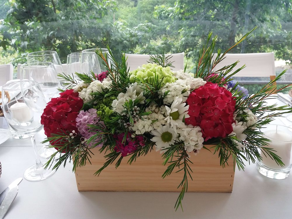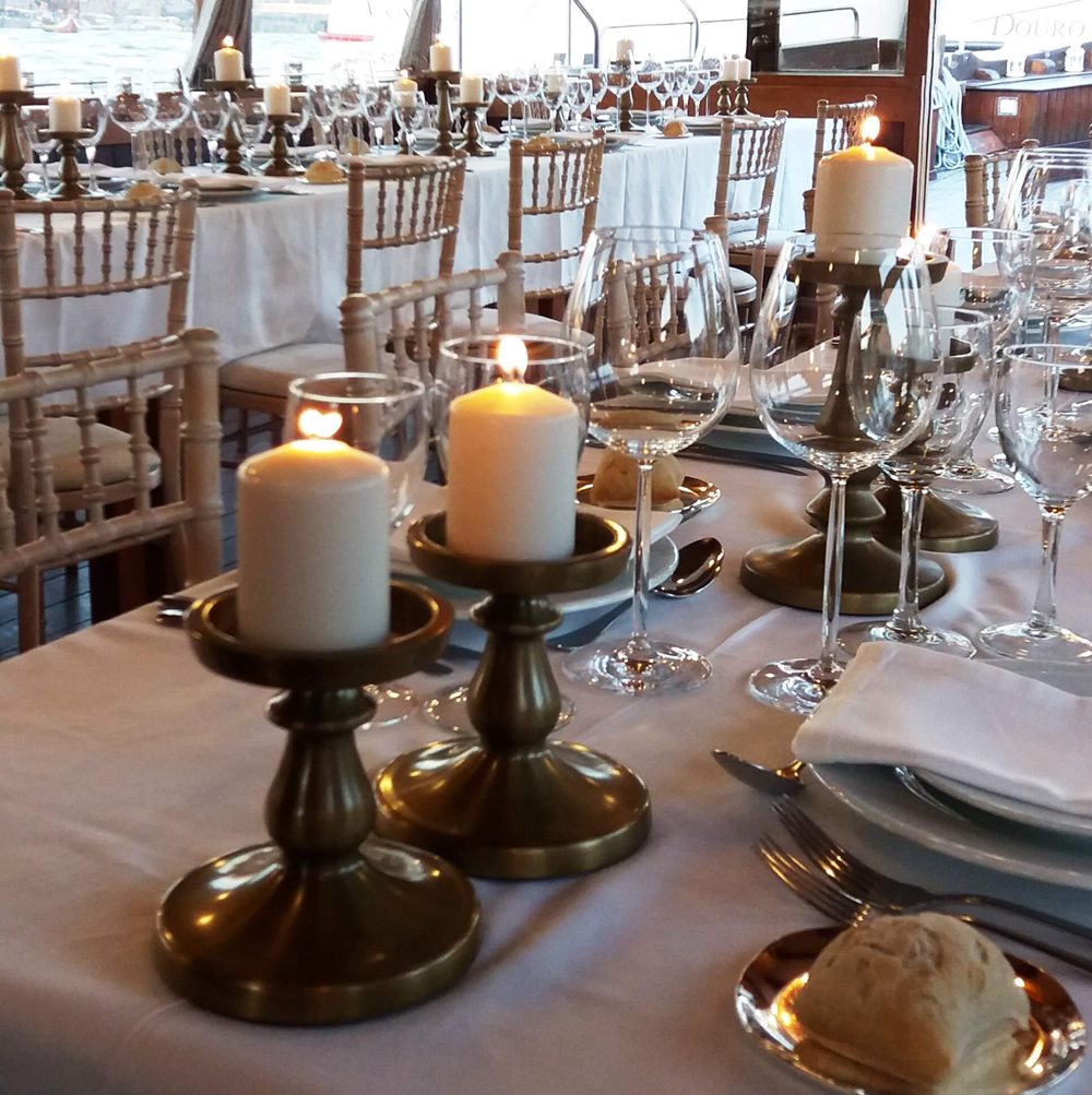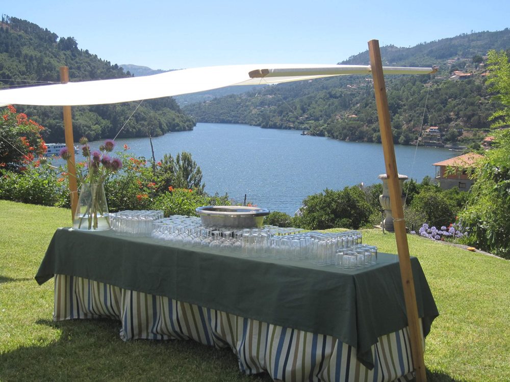 Mesas com camilhas brancas, cadeiras de madeira com coxins e costas brancas