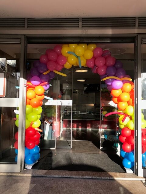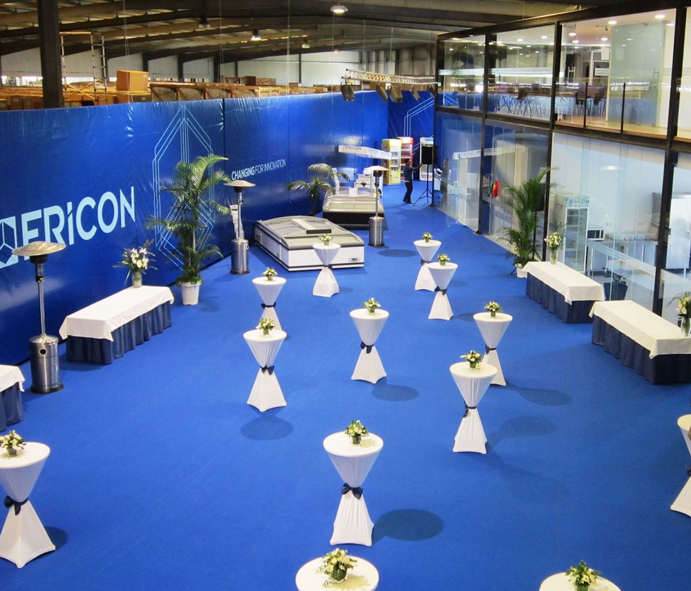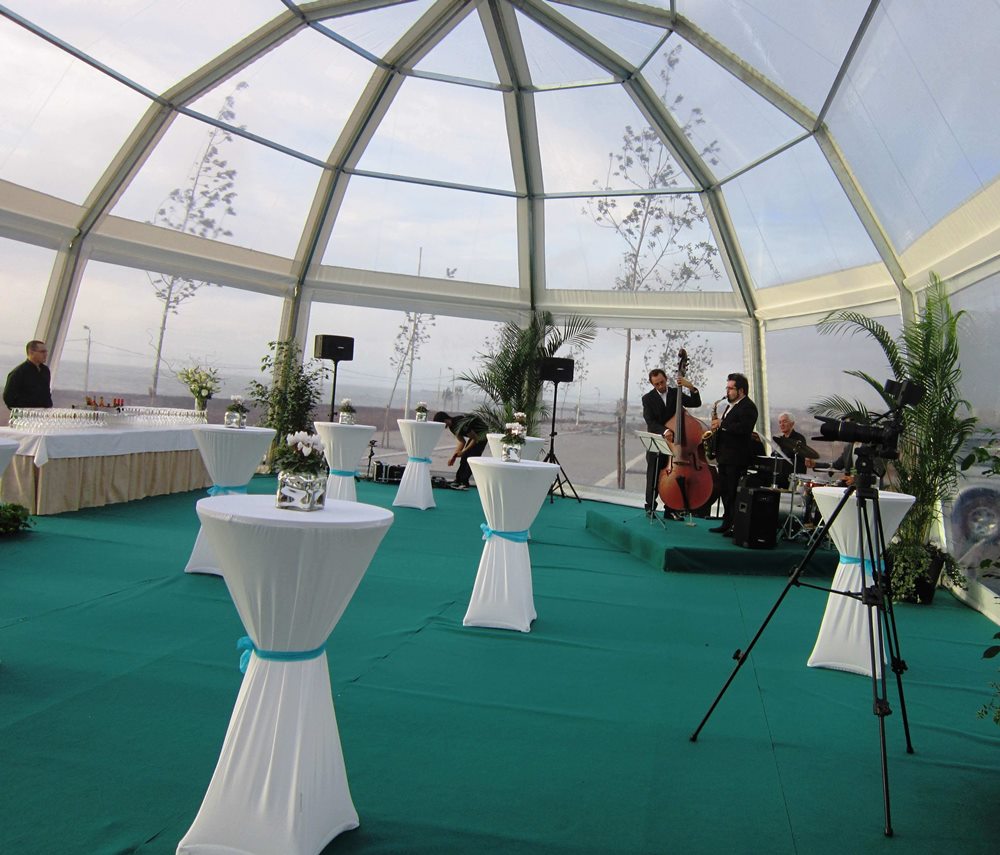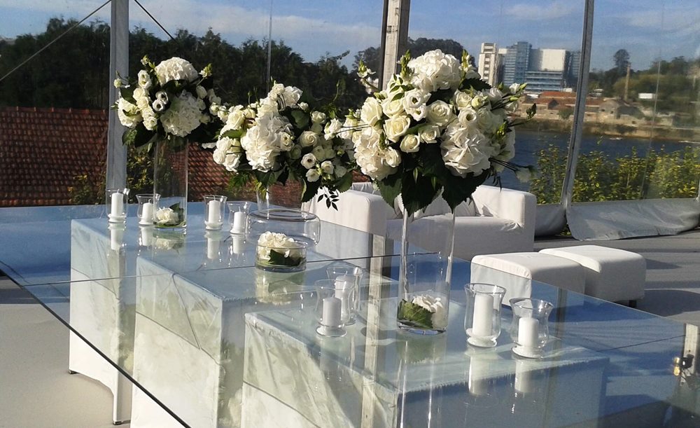 Mesas bistro com forros brancos ou pretos, cadeiras altas pretas