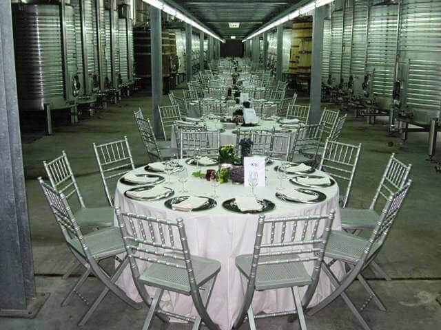 Mesa com saial beije e toalha branca, cadeiras com costas e coxins